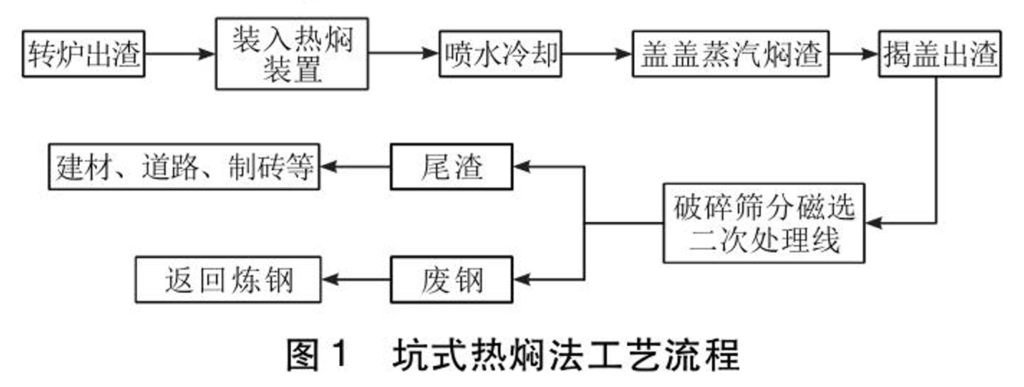 该技术解决了钢渣中f-CaO、f-MgO造成的钢渣稳定性差的问题,坑式热焖法工艺路线如图1所示。